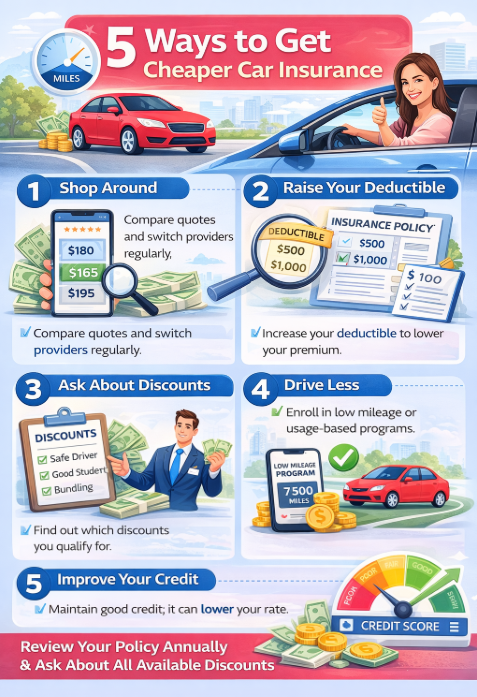 Common ways to reduce car insurance costs include maintaining a clean driving record, selecting a deductible you can afford, and qualifying for discounts.