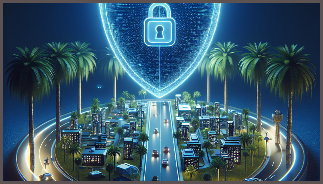 Cybersecurity shield protecting a tech startup in Florida.